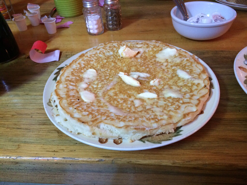 Today is the day to pass over the continental divide via Rogers Pass. Started out in the rain. But first, breakfast in Lincoln. See the pancakes are huge: