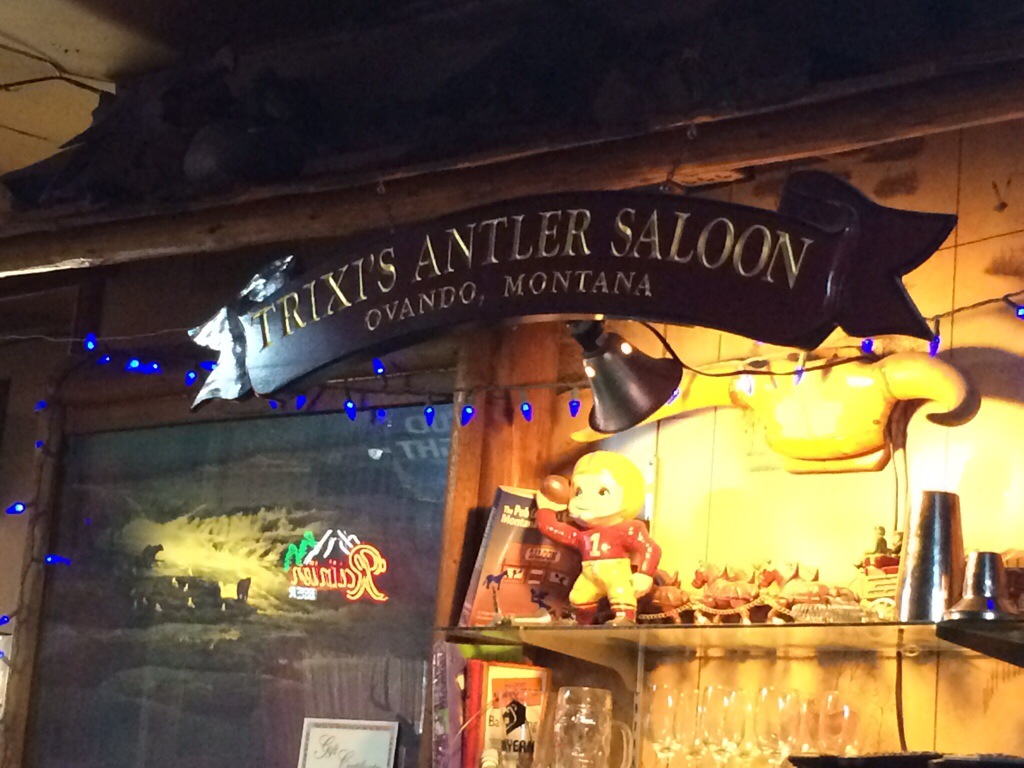 Then it was a long downhill to the construction site. Loaded up the bike and then unloaded after the construction. The skies cleared for a pleasant ride to Ovando for lunch at Trixi’s Antler Saloon. Trixi was fun, called us crazy (the most common reaction to our journey) and served up a good lunch. The cherry pie sealed the deal.