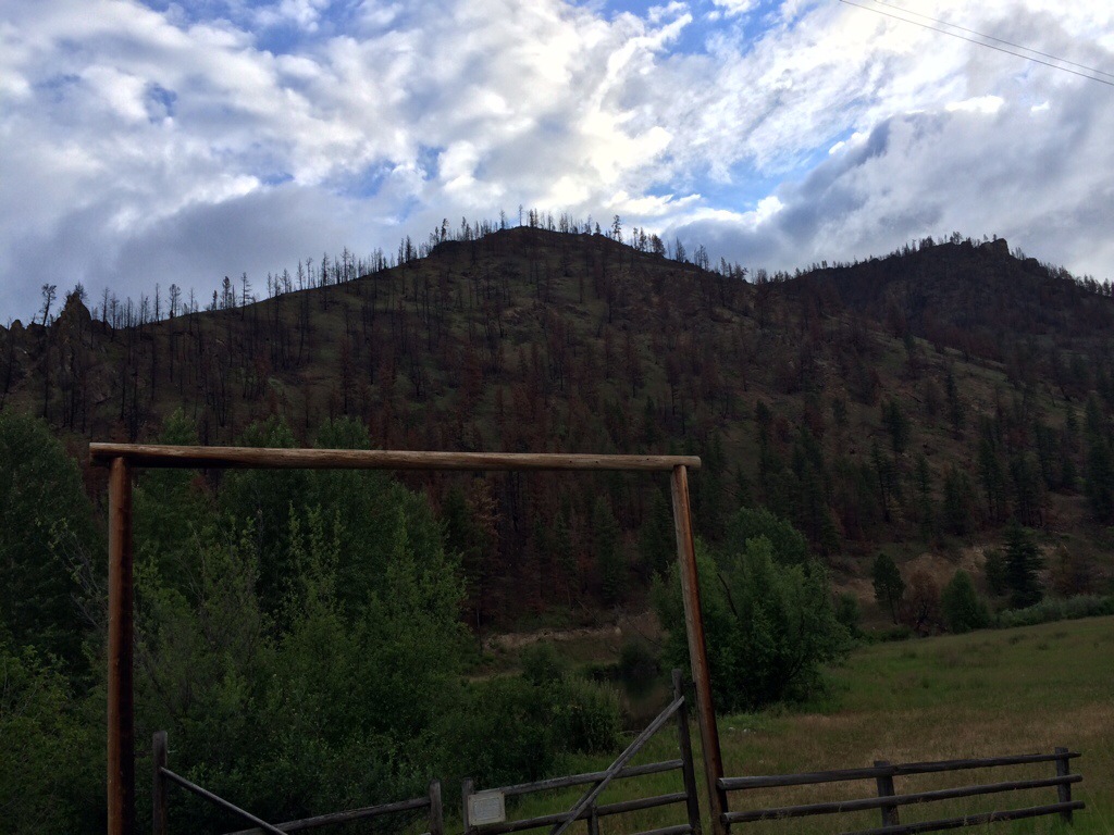As I left Lolo, the road began a gradual climb towards the pass. Cloudy weather, but no rain (yet). Passed many farms and some evidence or a not to distant past forest fire along some of the mountains.