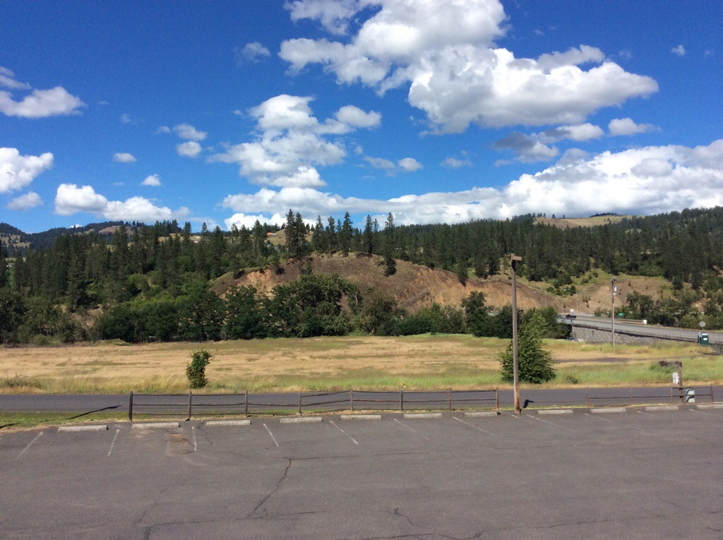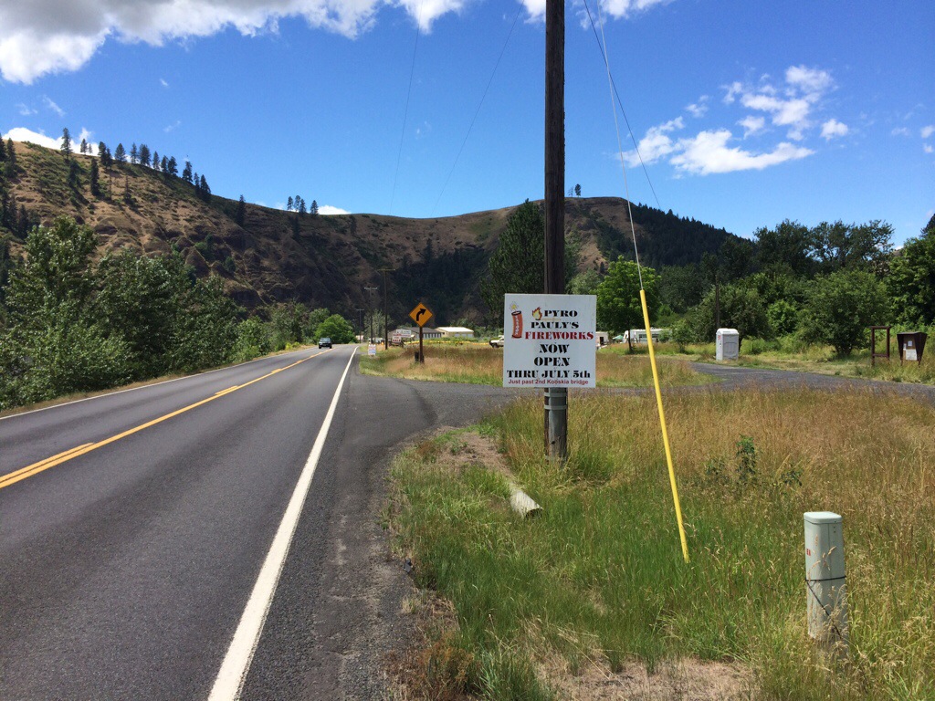 While there, it started to pour from the skies above, so good planning on my part for the stop. The rain stopped and I was on my way. More down grade and then out of the national forest to houses along the road again. The road wound along the Clearwater River (the Lochsa and Selway rivers join to form the Clearwater). I wish i would have stopped to get a picture, but the Tram like cars that popped up every once in a while were interesting. There are cables stretched across the river and trams that ferry people to the other side where beautiful homes are. There appears to be limited road access to these homes and it must be a long way around to to bridges for more conventional crossings. Fireworks are big around here: